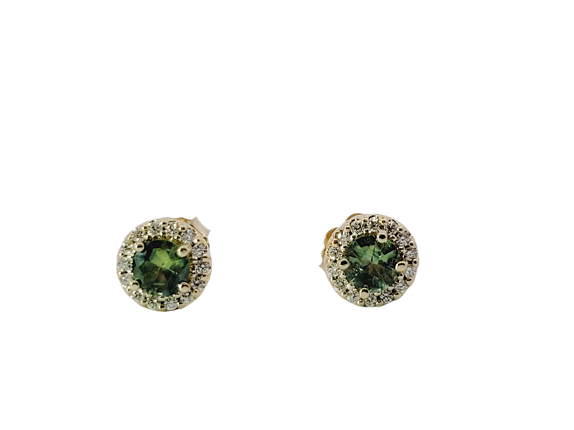 Step up the daring with these 14k Australian Parti Green Sapphire and Diamond Studs! Featuring a set of mesmerizing Green Sapphires with blue undertone in a natural diamond halos , these studs are a true adventure for the eyes.