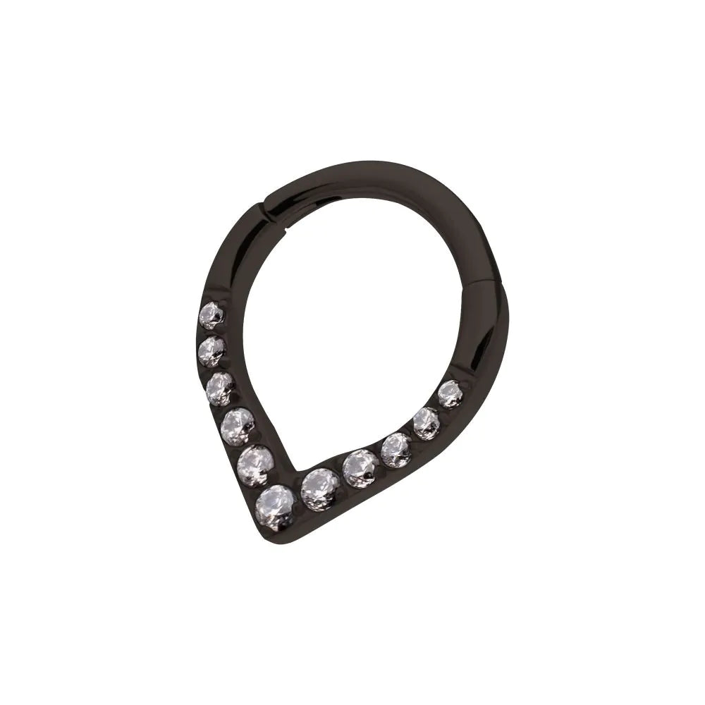 Black PVD Titanium CNC Set Gem Front Facing Teardrop Shape Hinged Segment Clicker. Manufactured from High Polish Implant Grade Titanium (Ti-6AL-4V-ELI ASTM F136).