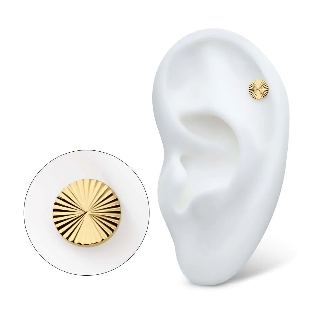 24Kt Gold PVD Titanium Threadless Corrugated Round Top is made from Implant Grade Titanium TI-6AL-4V ELI ASTM F136 with 25g durable Titanium Pin designed to be practical and easy to use. Fitting all sizes of pins and bases in our threadless body jewelry line. Pin Size: 0.45mm x 4.7mm.