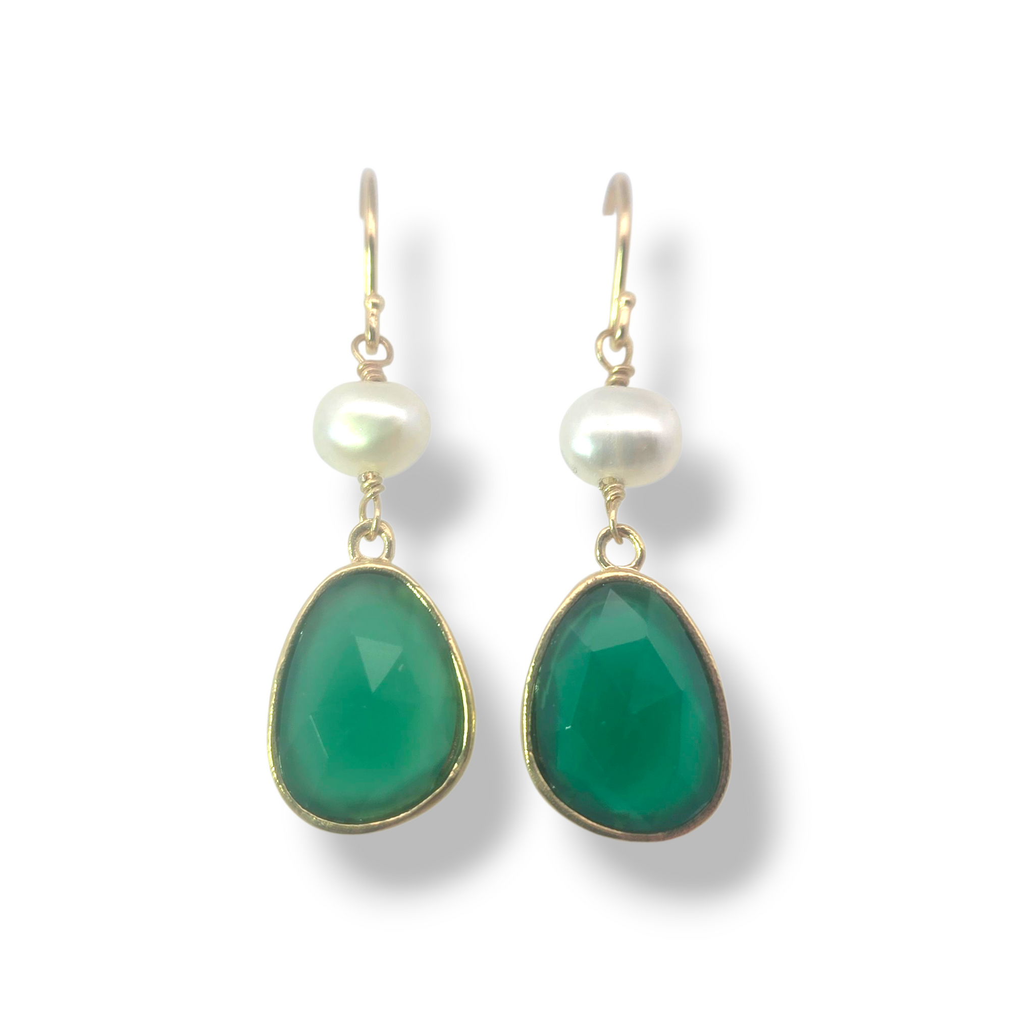 Gold Plated Sterling Oval with Faceted Green Onyx and Pearl Earrlings