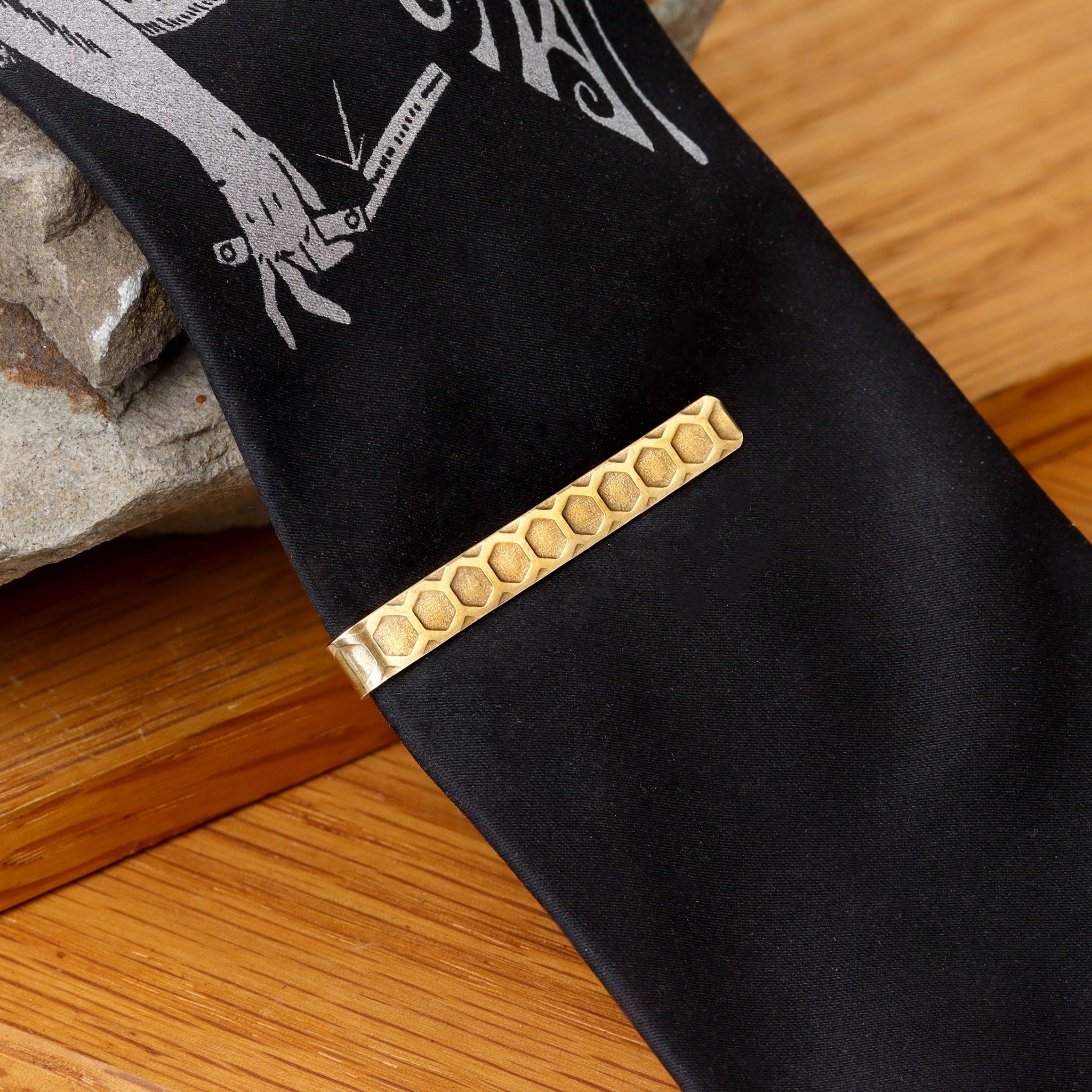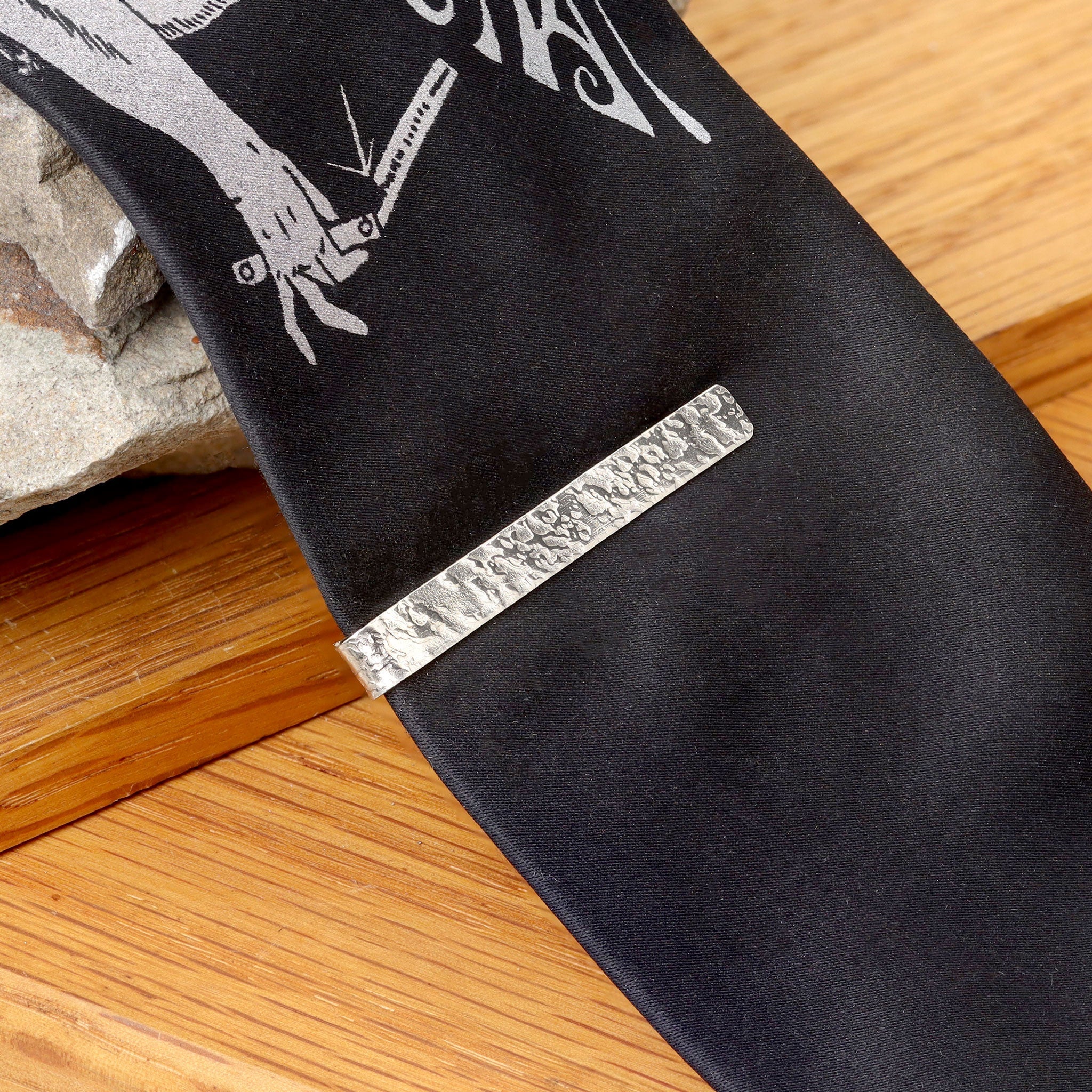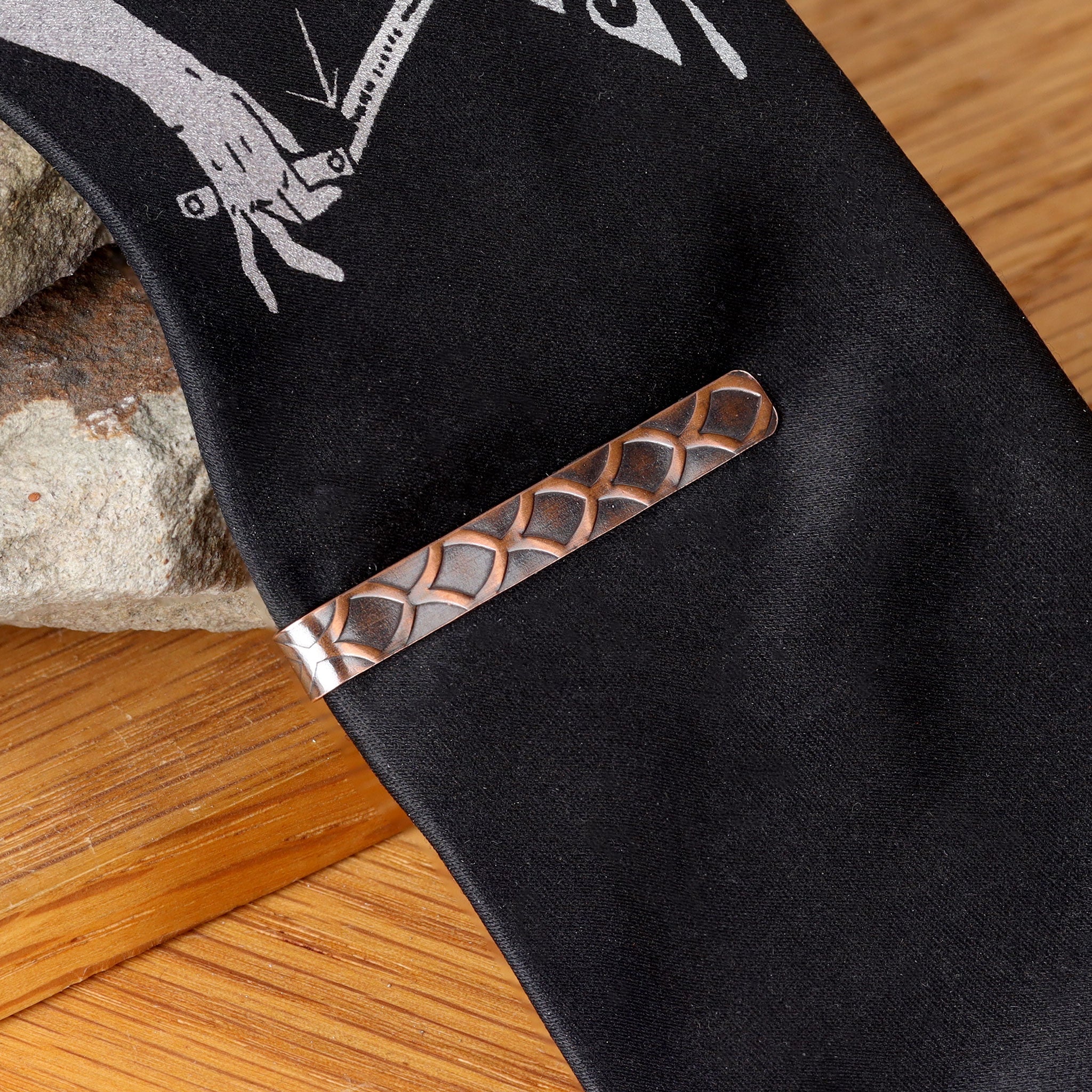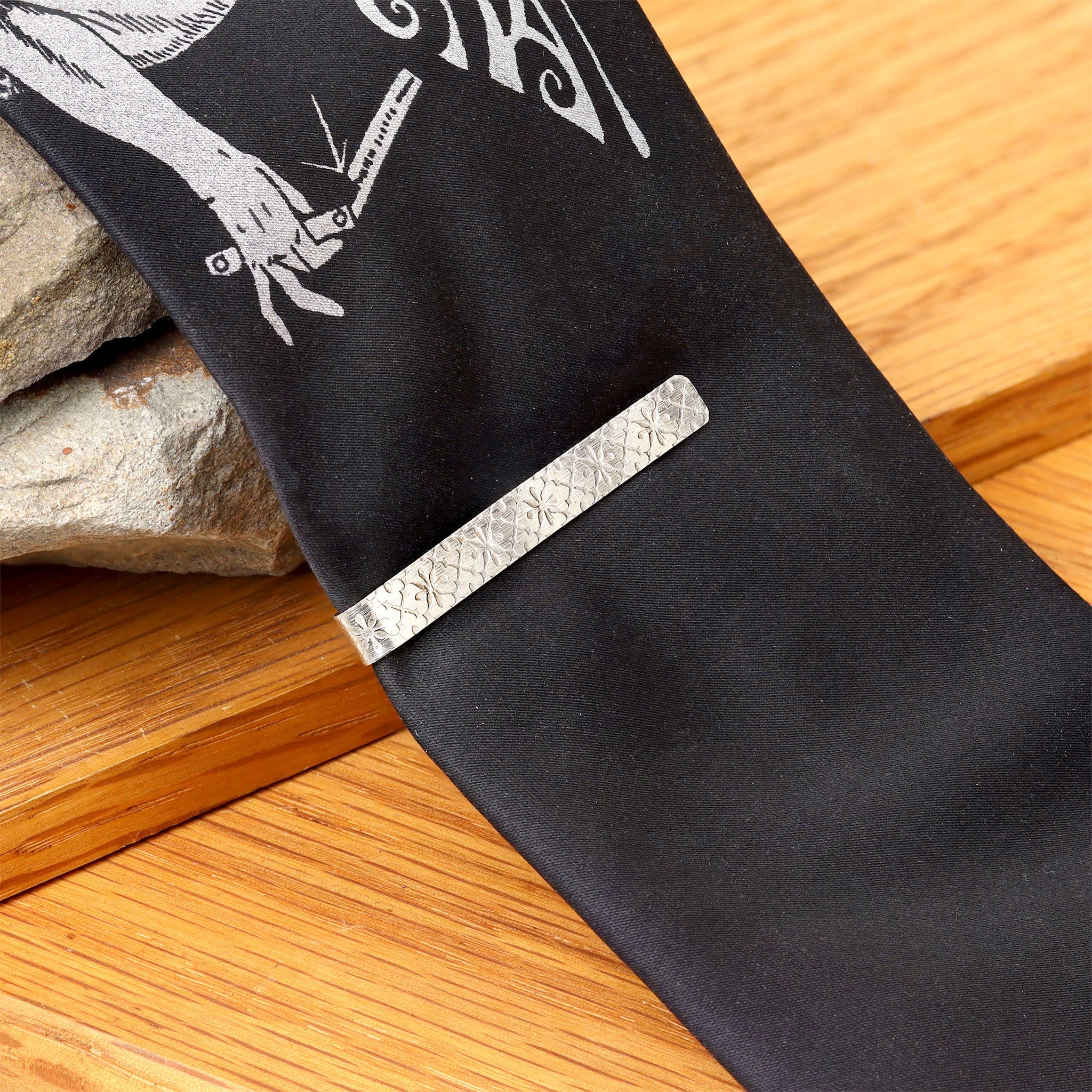 Add some personality to your attire with our Patterned Tie Clips. They feature embossed, patterned metal for a one-of-a-kind texture, making them a stylish and functional accessory. Each clip is hand forged, ensuring top quality. Keep your suit on point with a touch of intrigue.