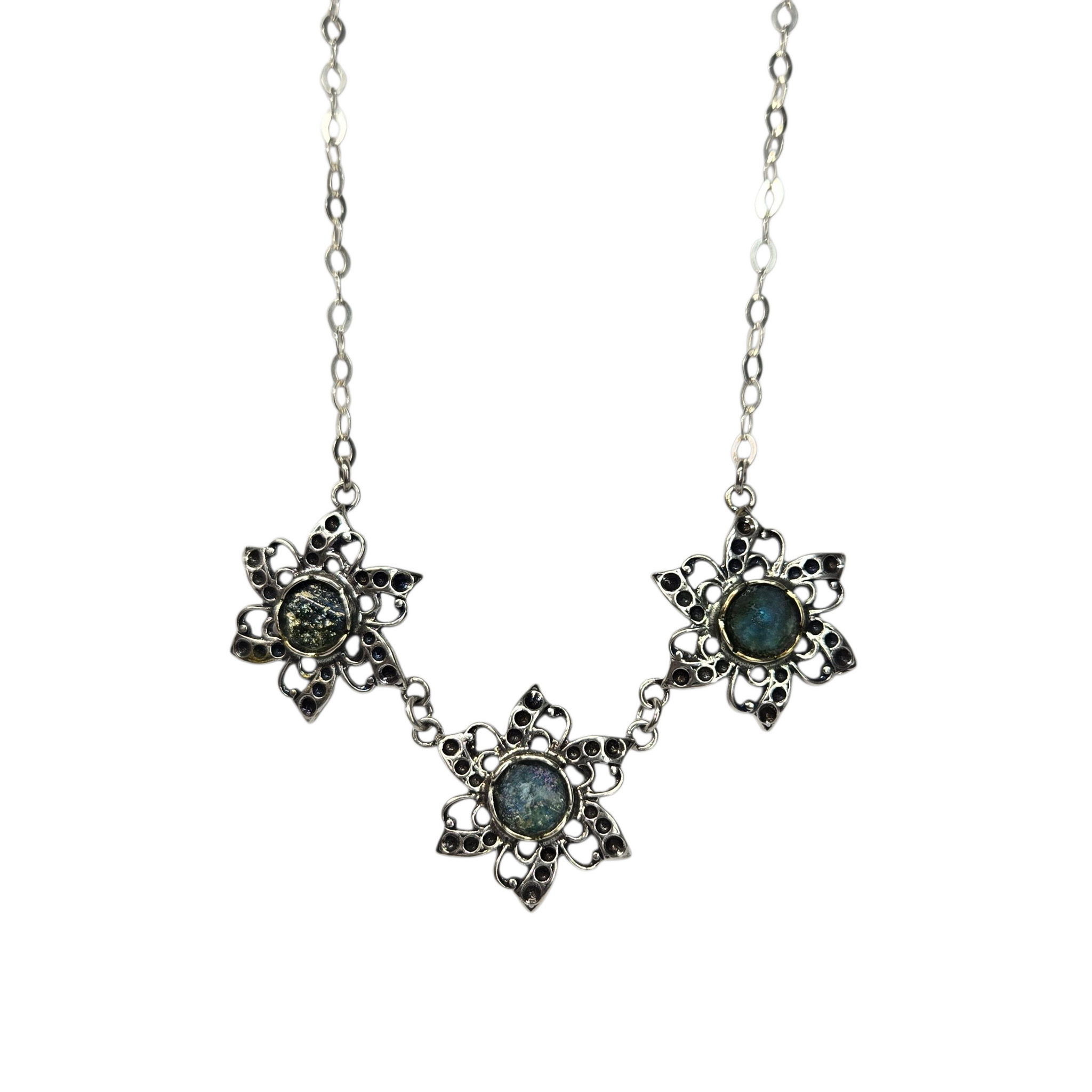 Sterling Triple Flower Necklace with Ancient Roman Glass