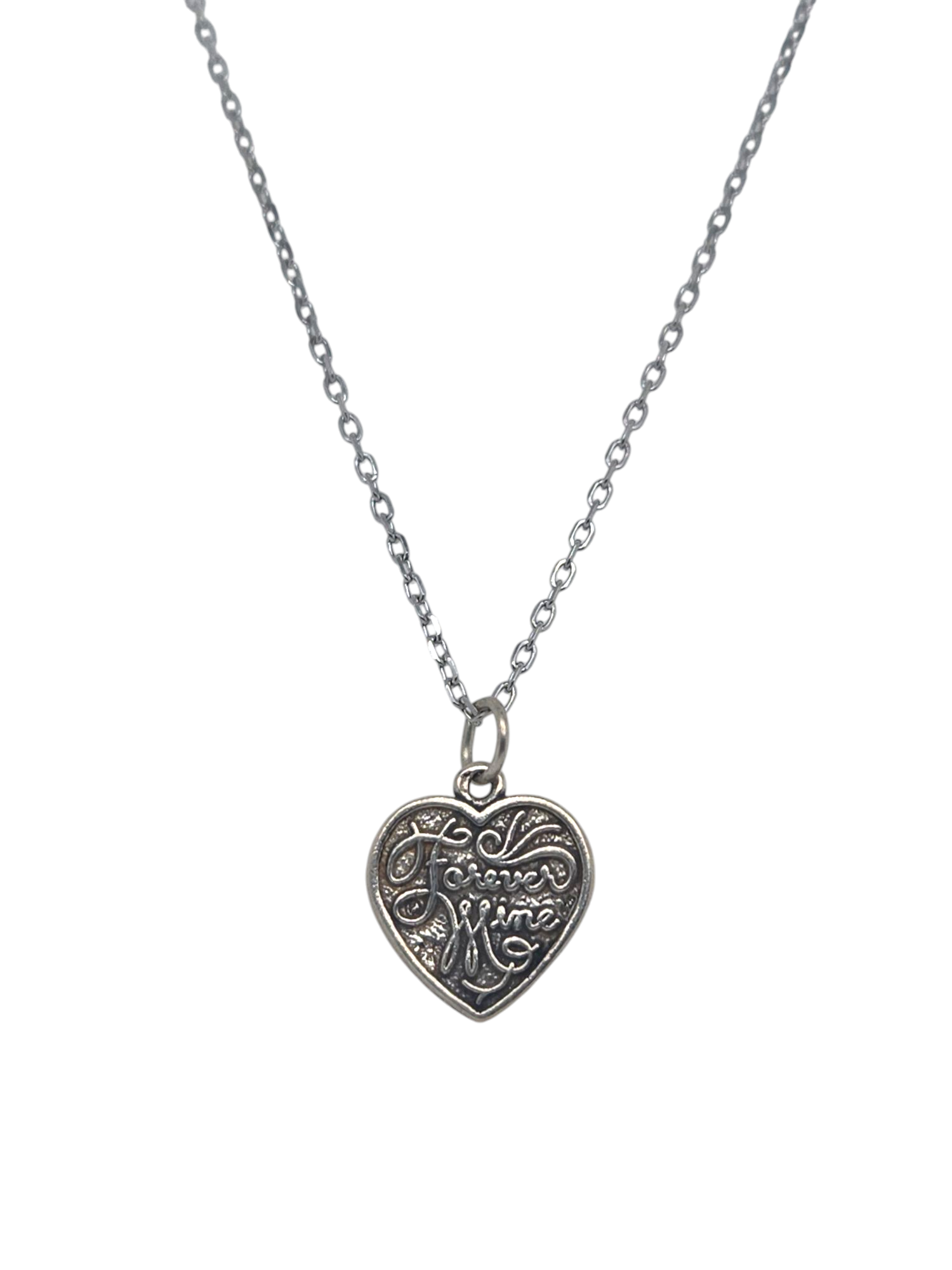 Oxidized sterling silver charm features ornate design and "Forever Mine" on one side and "Forever Yours" on the other side. Charm measures 14mm x 16mm.