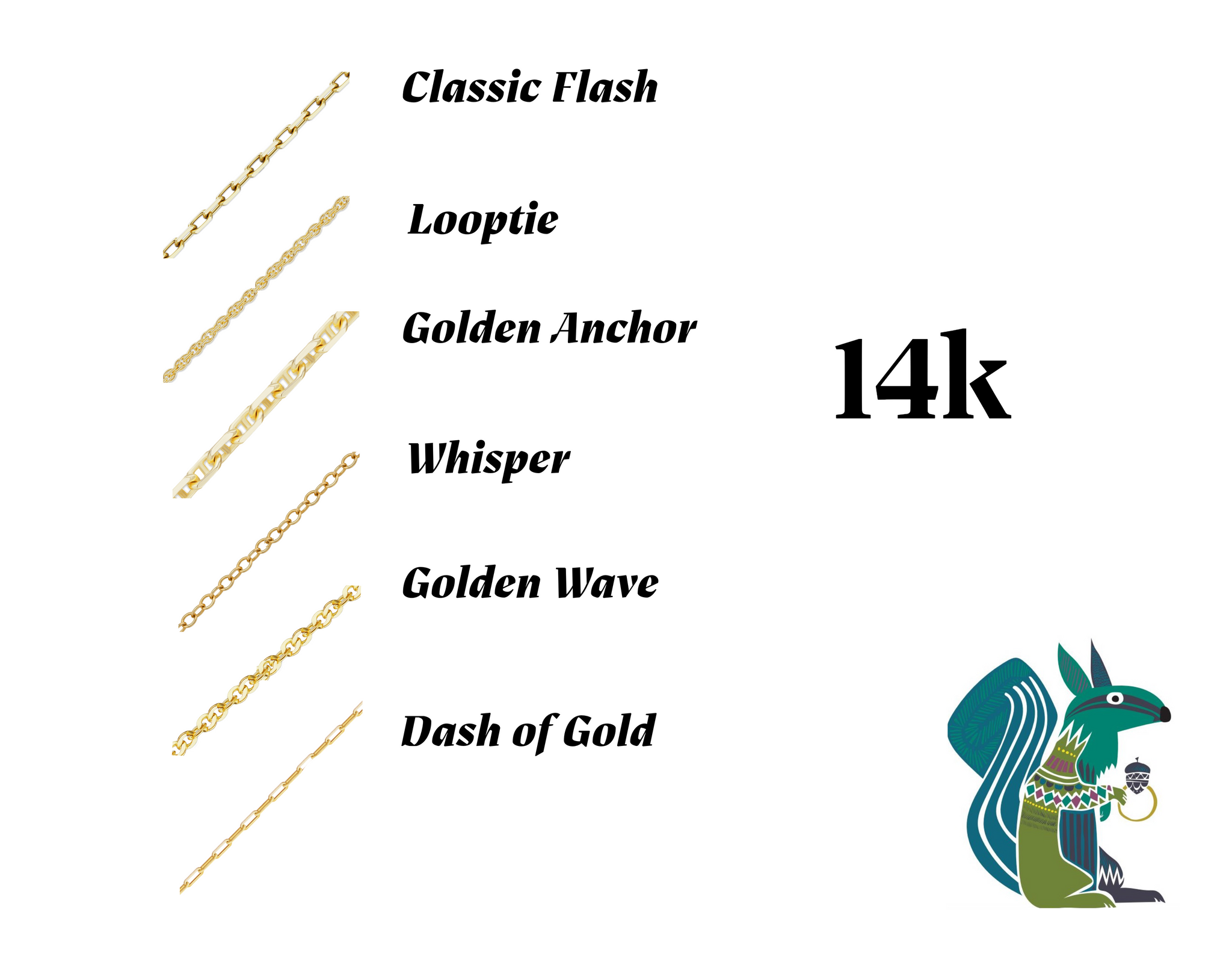 We currently offer chain selections in Sterling Silver, Gold-Filled, and 14k Gold. We are also happy to accommodate requests.
