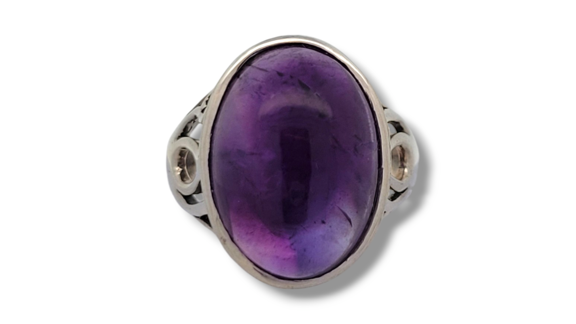 • oval amethyst set in a tall bezel with pierced decorative designs