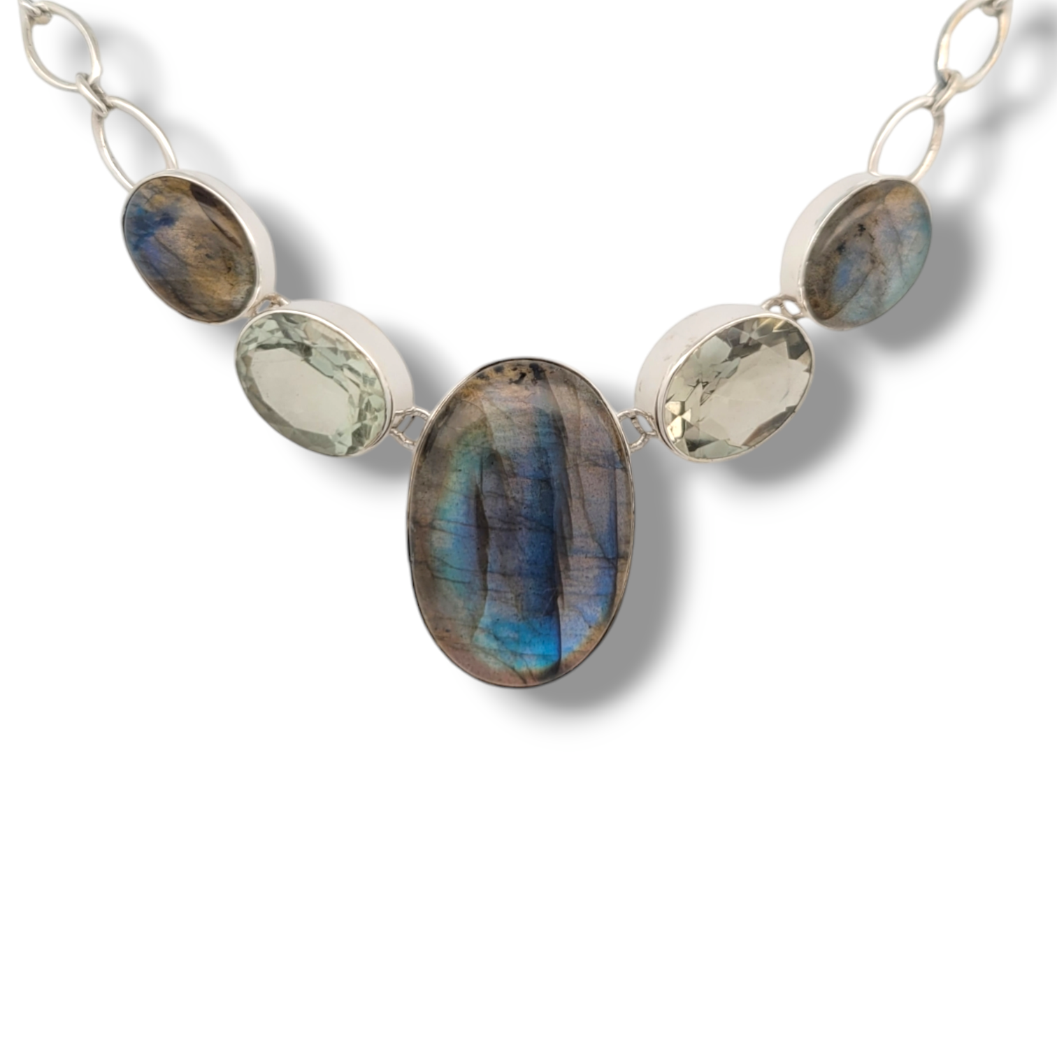 Sterling Silver Oval Labradorite Cabochon and Green Amethyst Necklace