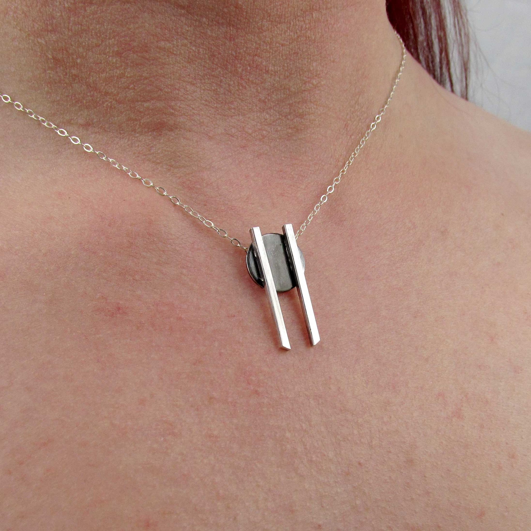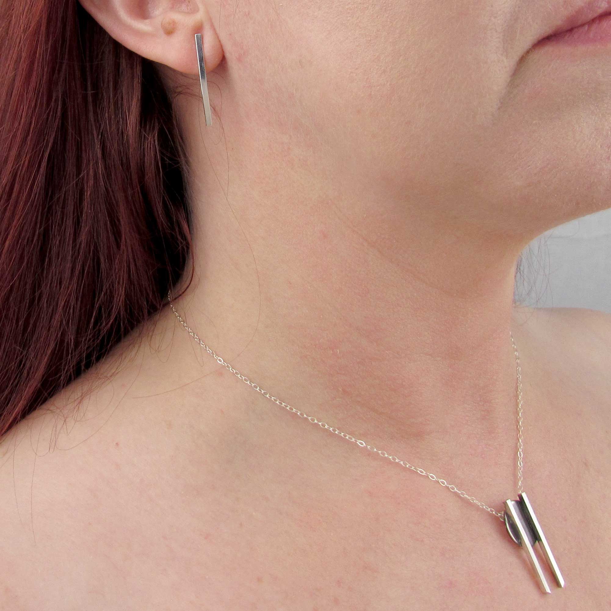 The Gateway is a call back to the Art Deco era of the 1920's. Two sterling square bars braced against a 12mm blackened silver disc. The Gateway was created along side the Silver Bar Earrings, ensuring a perfect pairing.